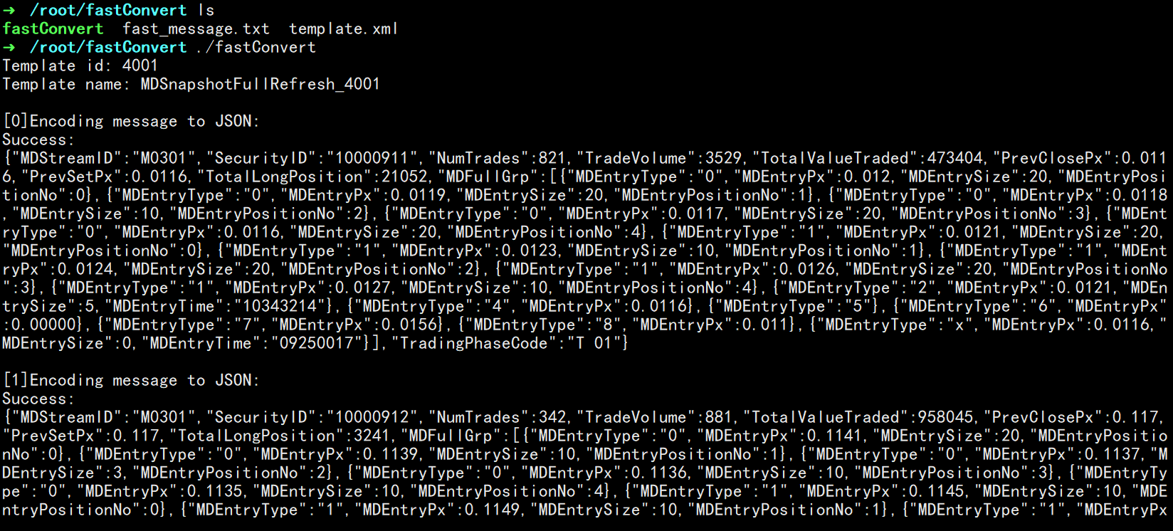 将模板文件命名为template.xml,fast数据流文本命名为fast_message.txt,与Demo程序放在同一个目录,运行Demo程序即可打印出json格式化的解析结果。